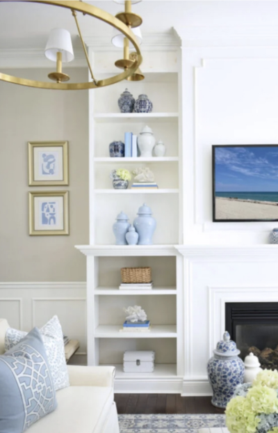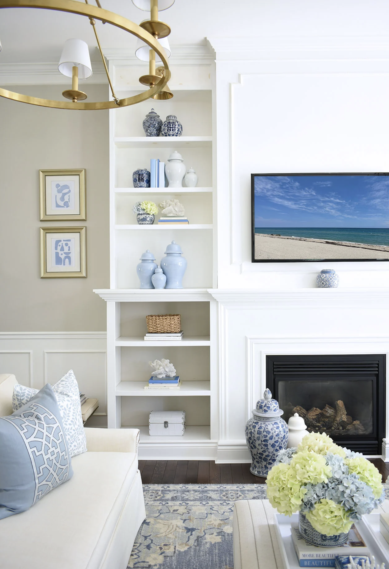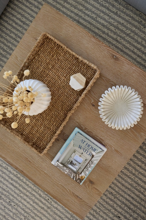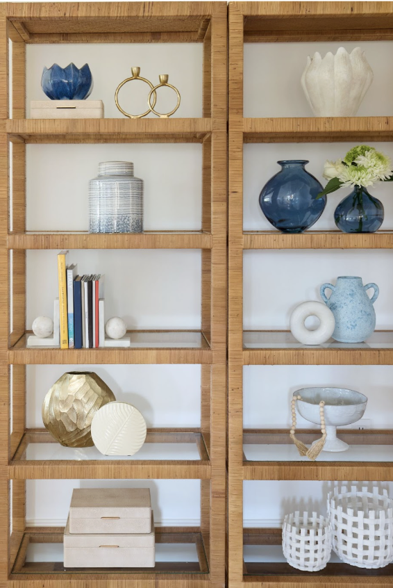 When styling the built-in shelving, we focused on variation in height, shape, and material. Ceramics, glass, woven pieces, and books were layered together to create visual interest while still allowing the eye to rest. Blue tones were subtly repeated through glassware and accessories, tying back to the wider color palette, while warm woods and natural fibers grounded the composition and kept it feeling relaxed and coastal.